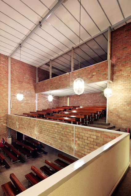El edificio se halla en el centro del casco urbano y de mayor actividad de la ciudad. Se configura y desarrolla siguiendo criterios de austeridad, tanto funcional como constructivamente. Podemos decir que es de una sencillez ejemplar y de sorprendente claridad compositiva. El ladrillo cerámico sin revestimiento exterior, la estructura portante metálica y los perfiles del mismo material para las carpinterías componen lo principal del repertorio de materiales; sin embargo, ninguna merma parece sufrir la calidad de sus espacios, tanto de la iglesia como del propio convento. El edificio es totalmente regular y por tanto también los espacios que lo configuran. La iglesia, a la que se accede por un extremo, bajo el doble coro, tiene en el extremo opuesto el altar algo elevado, dejando a su vez, bajo él, una capilla en semisótano. Sobre el volumen principal y único de la iglesia, con una estructura cerchada apoyada en los soportes perimetrales que se sitúan en la fachada y medianería laterales, se cuelgan los tres niveles que componen el convento; el nivel inmediato sobre la iglesia alberga un amplio y exento claustro, y sobre él las dependencias de la comunidad, para culminar con las celdas bajo las pendientes de los faldones de cubierta.