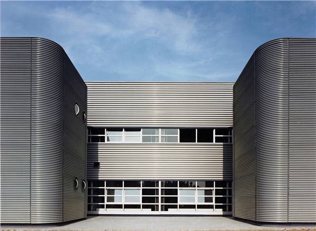 La primera construcción de Nicholas Grimshaw en el Vitra Campus de 1981 se considera una auténtica declaración en favor de su uso industrial y de la competencia técnica de Vitra. Desde la planificación hasta el acabado del pabellón, construido con elementos prefabricados, transcurrieron únicamente seis meses, el plazo cubierto por el seguro tras el gran incendio que asoló la finca. El edificio, cuya fachada está compuesta por chapas de aluminio que forman ondas horizontales, alberga, además de las salas de producción, dos salas de exposición.