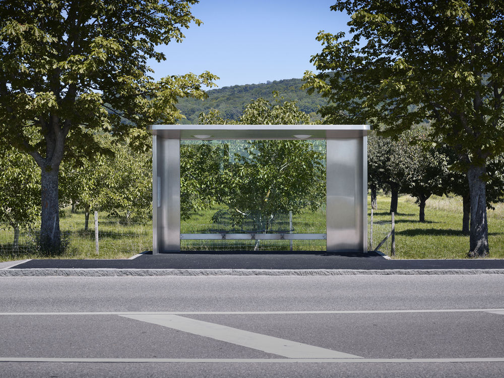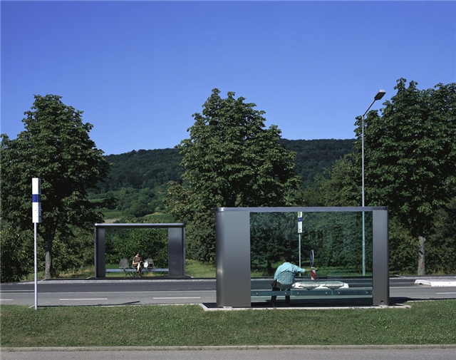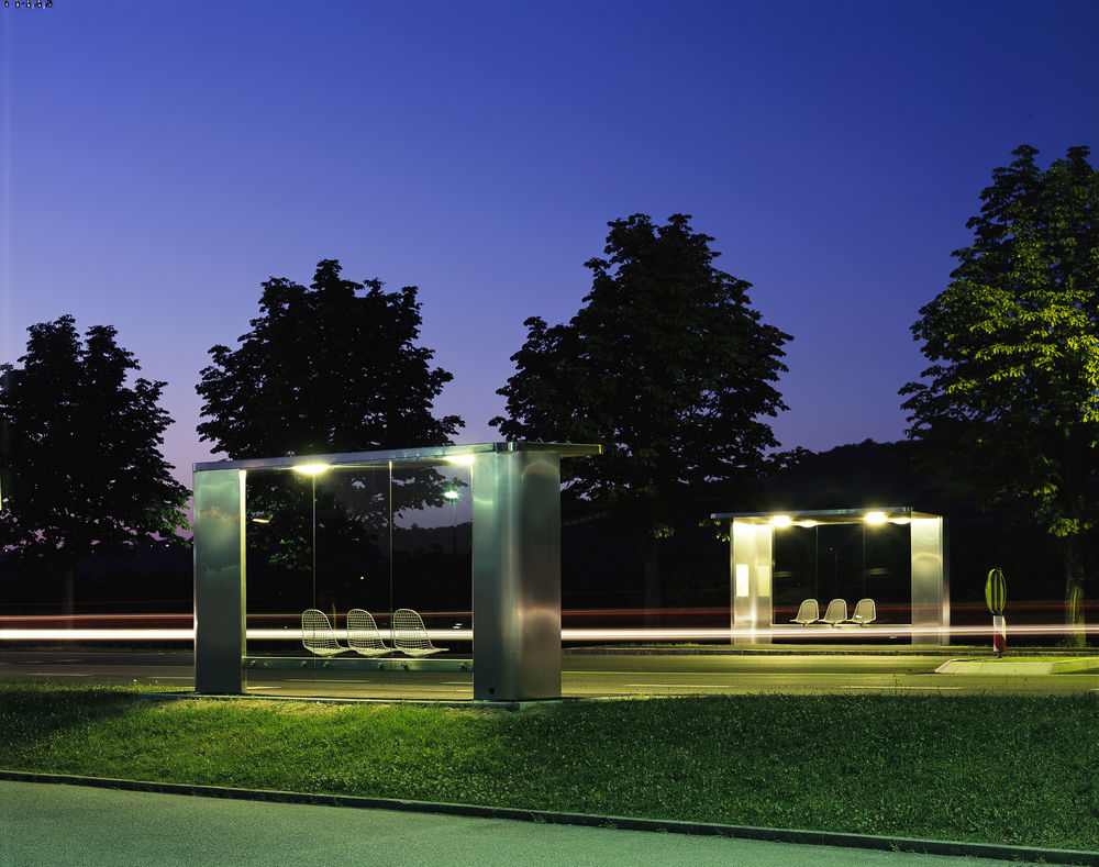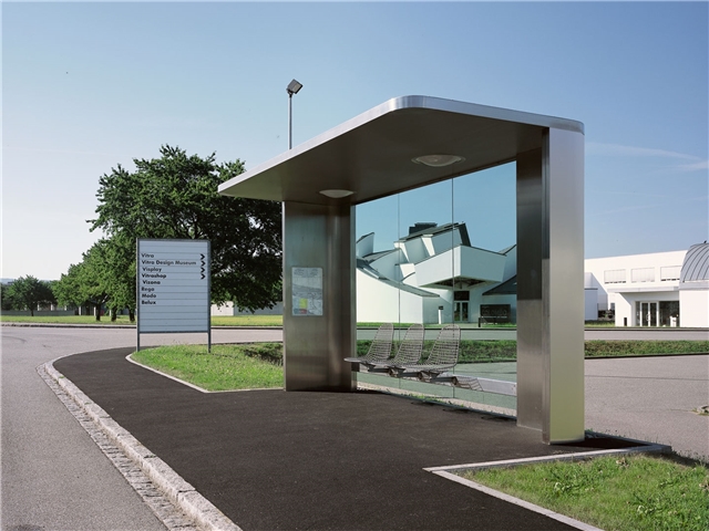 La parada de autobús fabricada en acero pulido permite contemplar el Vitra Campus y el pueblo vitivinícola de Ötlingen a través de sus paredes de cristal. Las paradas de autobuses cuentan con Wire Chairs, diseñadas por Charles y Ray Eames y producidas por Vitra. Ambas paradas de autobús son la entrada al Vitra Campus. Con ellas, Jasper Morrison ha creado una obra única de formas elegantes y sencillas.
