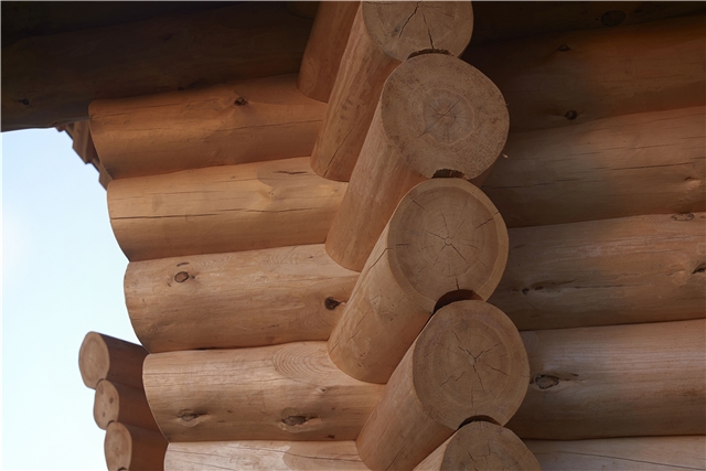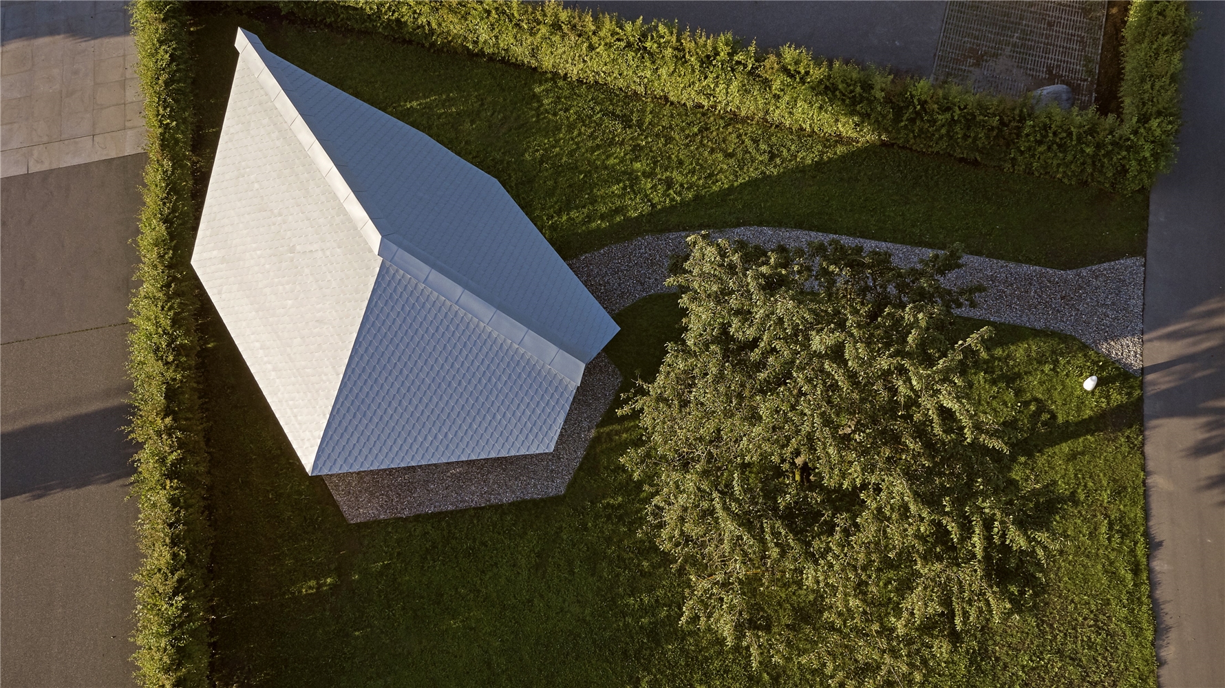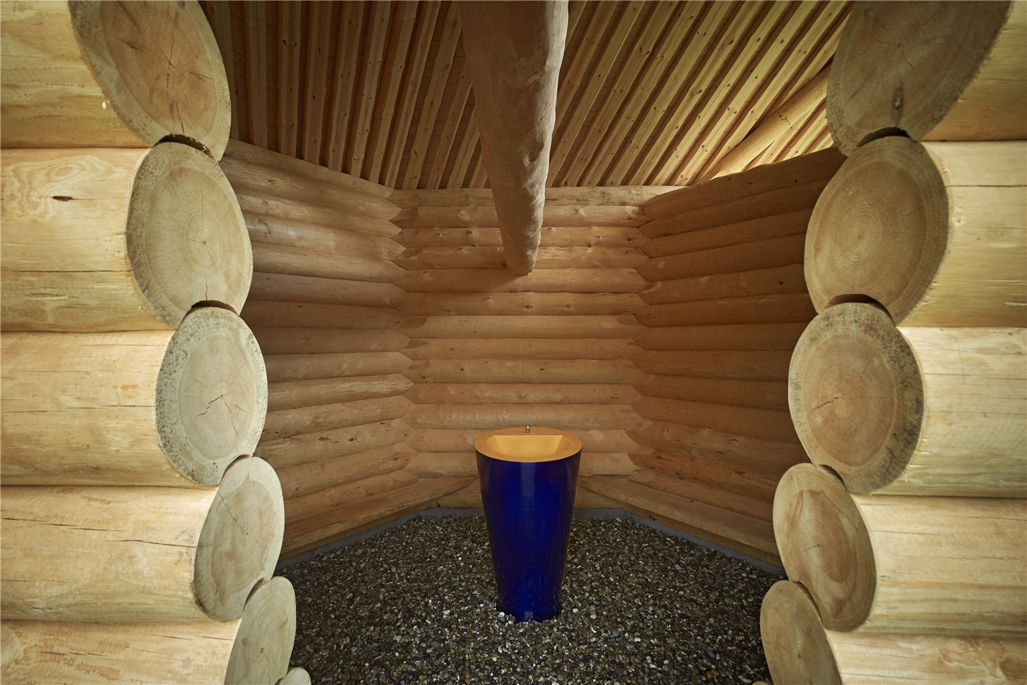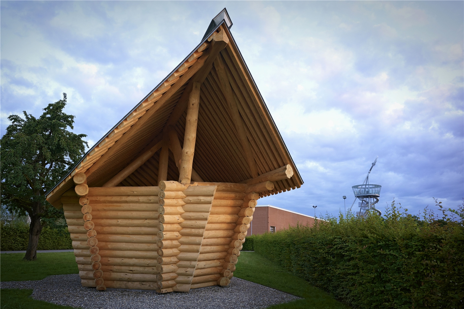 Blockhaus tiene una planta hexagonal ligeramente irregular. La cabaña está realizada en madera de pino nórdico sin tratar y con el paso del tiempo adquirirá un tono grisáceo. Su llamativo tejado está recubierto de tejas de zinc y titanio, de manera que el brillo del metal crea un fuerte contraste con la rústica estructura de troncos.